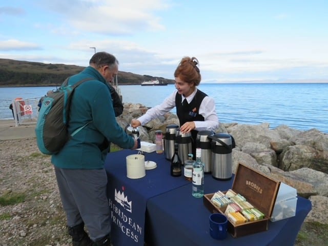 The fine weather returned to welcome us all ashore at picturesque and remote Shieldaig. Walkers strode out for longer walks along the headland (yes, including ‘that’ section of slope with a chain so well described by one of our guides), while others enjoyed strolls around the village and surrounding area. A welcome hamper of teas and coffees (and something stronger!) once again awaited us at the jetty as we rejoined the ship – tenders supplemented by the speedboat for more exhilarating rides for those who fancied it. The morning was rounded off with a Hebridean tradition – Friday Hebridean Fish and Chips, even if enjoyed on a Sunday on this occasion.