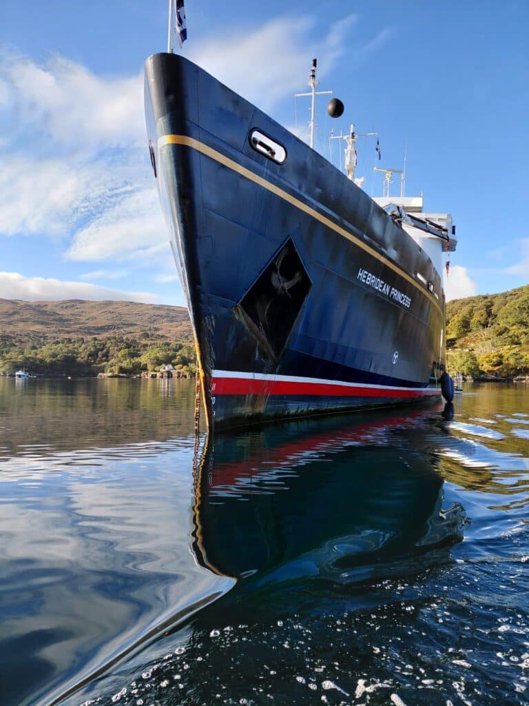 A smooth ride up from Glasgow for those guests who travelled on the Hebridean Island Cruises coach – glorious autumn colours along Loch Lomond, stunning views from our stop at Inverary, and evening sunshine as we arrived in Oban to board the Princess. A very warm welcome from Captain James and all aboard, and the chance to reunite with old friends and make new acquaintances as we set sail into the sunset towards our peaceful overnight anchorage.