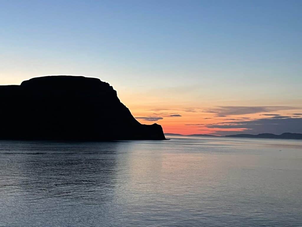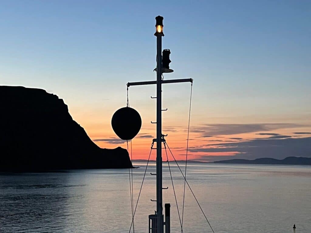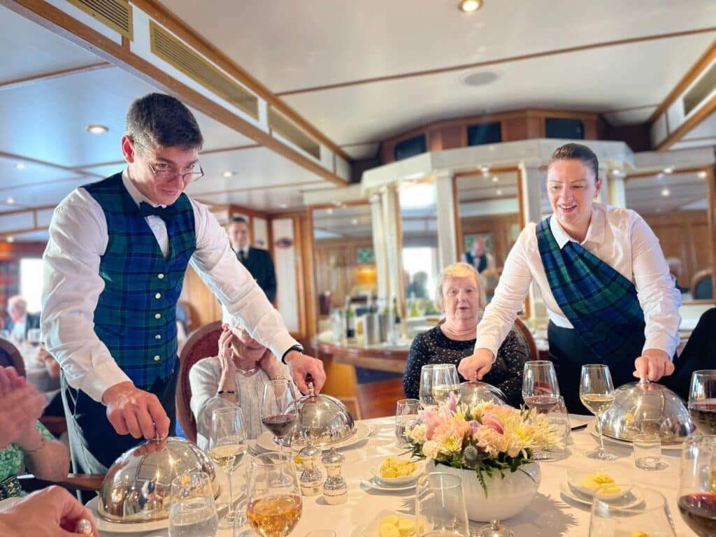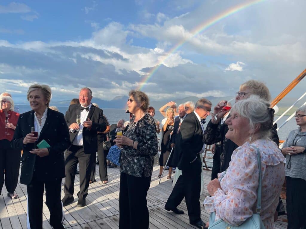 We anchored overnight off the Isle of Muck where the gala reception was held outside on the Skye deck, accompanied by dolphins, rainbows and a spectacular sunset.