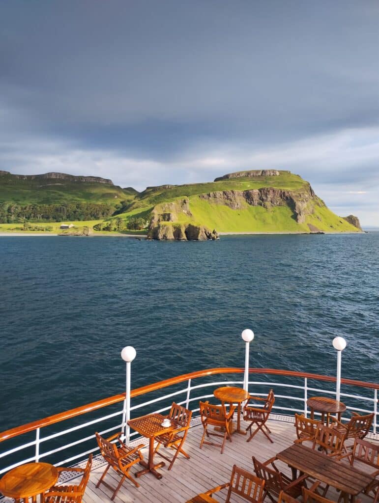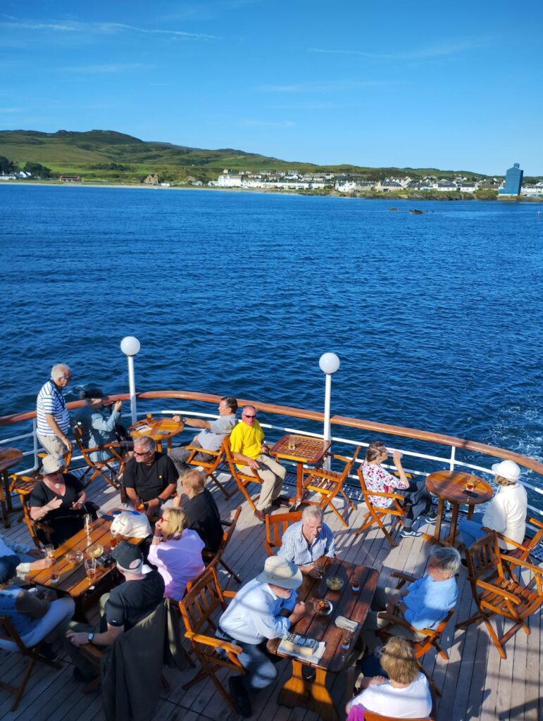 We sailed during the evening to Port Ellen where we berthed overnight, enjoying the warm evening – and for those who took late night drinks out onto the Skye Deck, the chance to watch the new ‘Buck’ Moon rising over Islay.