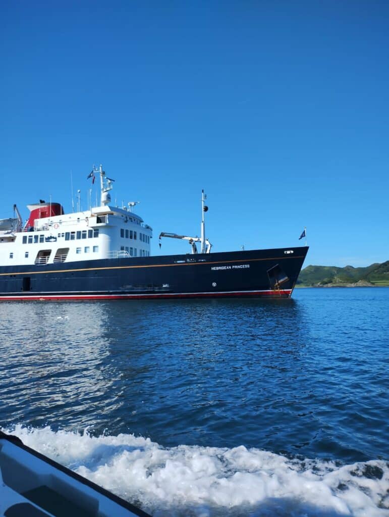 A warm welcome awaited guests at Glasgow Central Station and Airport from two of our Footloose Guides, who gave an interesting commentary during our very scenic and smooth journey to Oban. Guests were given an even warmer welcome on arrival on board Hebridean Princess, with Champagne and the chance to meet up with old friends and start making new ones. After a welcome talk and lifeboat drill we enjoyed a scenic evening sail to our overnight anchorage at Bloody Bay.