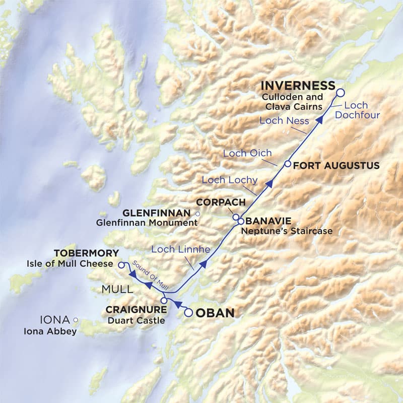 After exploring the delights of Mull and Iona, transit the tranquil inland waters of the Caledonian Canal, lured to the powerfully moving site of the final Jacobite rising at Culloden where 1,500 men were slain in less than an hour. A voyage of discovery through the Heart of Scotland.