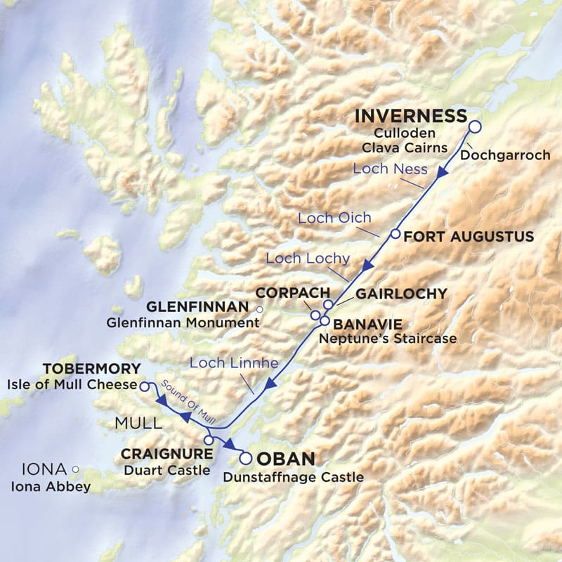 Starting in Inverness the Great Glen Way offers low-level walks along the towpath of the Caledonian Canal as Lord of the Highlands sails serenely by. As we leave the canal at Loch Linnhe, contrast the diverse landscapes of Mull and Iona before arriving in Oban, the Gateway to the Isles.