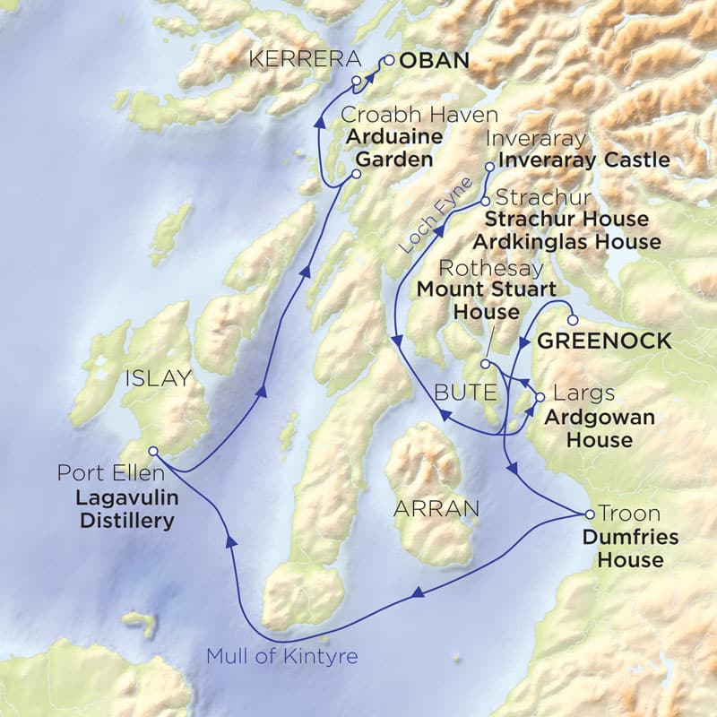 Soak up stunning coastal vistas and absorb the Clyde region’s most treasured historic houses and castles during unforgettable visits ashore. Evoking mystery and romance, these architectural gems hide secrets of an often turbulent past. Rounding Kintyre, an island distillery, colourful garden and rugged island also await.