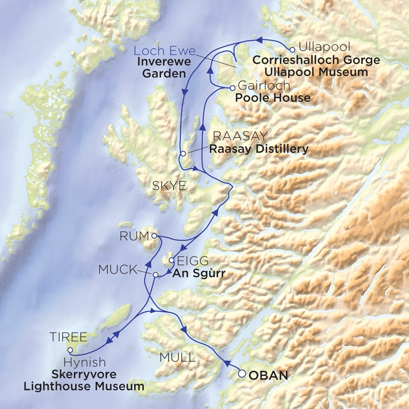 Our final morning is spent on Tiree, either discovering this gem of an island on foot or learning the story of the hazardous construction of Scotland’s tallest lighthouse, Skerryvore, on a dangerous reef ten nautical miles out to sea. Relax on board as we sail the Sound of Mull and reflect on our adventures, bound for Oban.