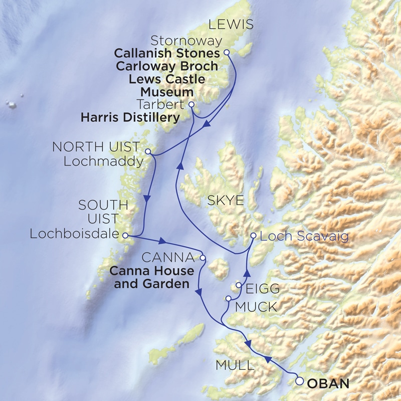 A roomy cabin that is in great demand, the Isle of Danna is tucked into a quiet corner on the port side of the Princess Deck. It contains a king-size bed, which can be converted into twin beds, and two comfortable chairs from which to enjoy panoramic views through full-size picture windows. Charming private facilities include a thermostatic shower.