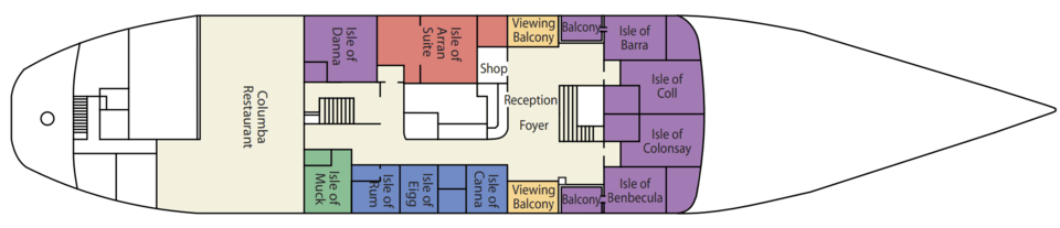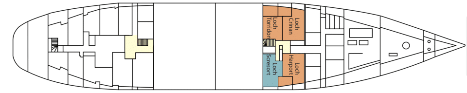 Replete with thoughtful touches like porthole windows for that classic maritime charm, the Waterfront Deck has plenty in the way of character – as well as 9 roomy cabins, gym equipment, and a card and games area for some added fun to your unwind time. It’s also the place where Hebridean Princess’ guests disembark ahead of their Scottish adventures with us.