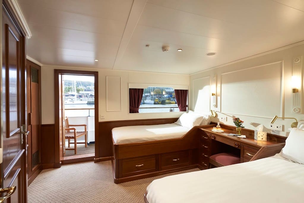 With a private balcony from which to marvel at stunning landscapes, this luxurious cabin welcomes guests with teak furniture, plush twin beds and en-suite shower facilities.