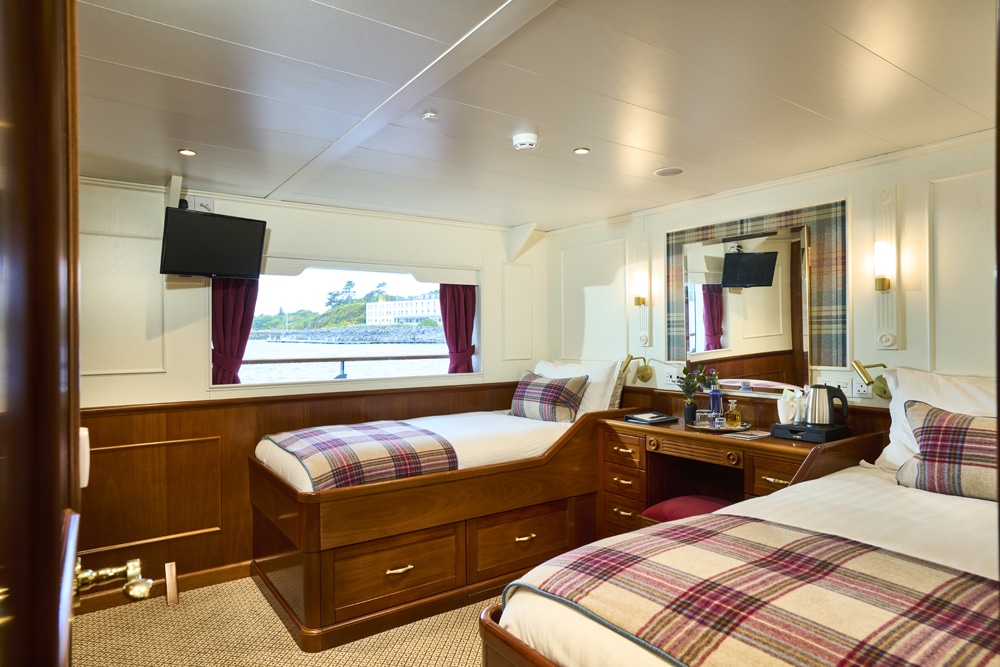 Outward facing to take in all we glide by, these bright and airy cabins feature comfortable twin beds and en-suite shower facilities complete with Molton Brown toiletries.
