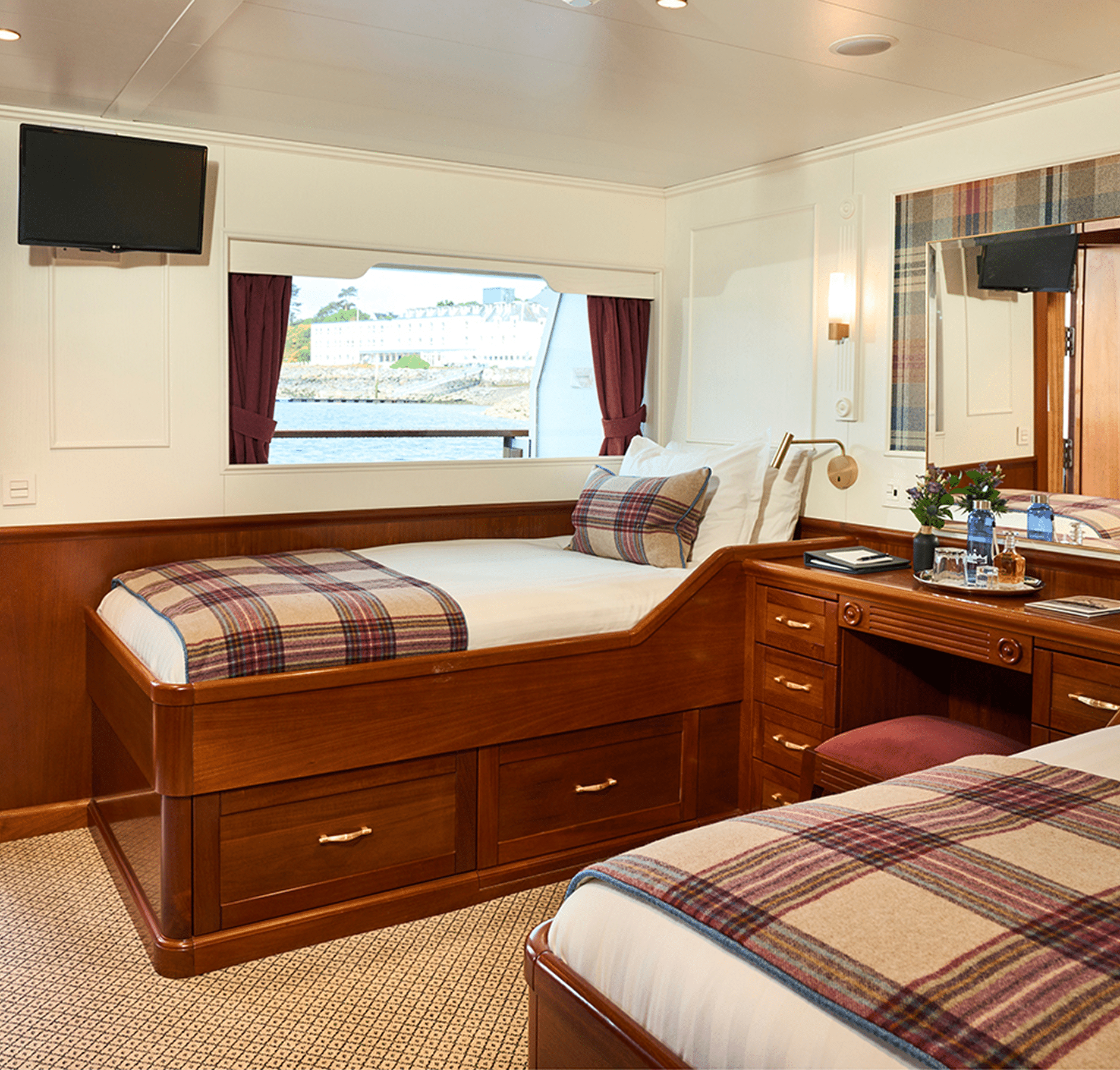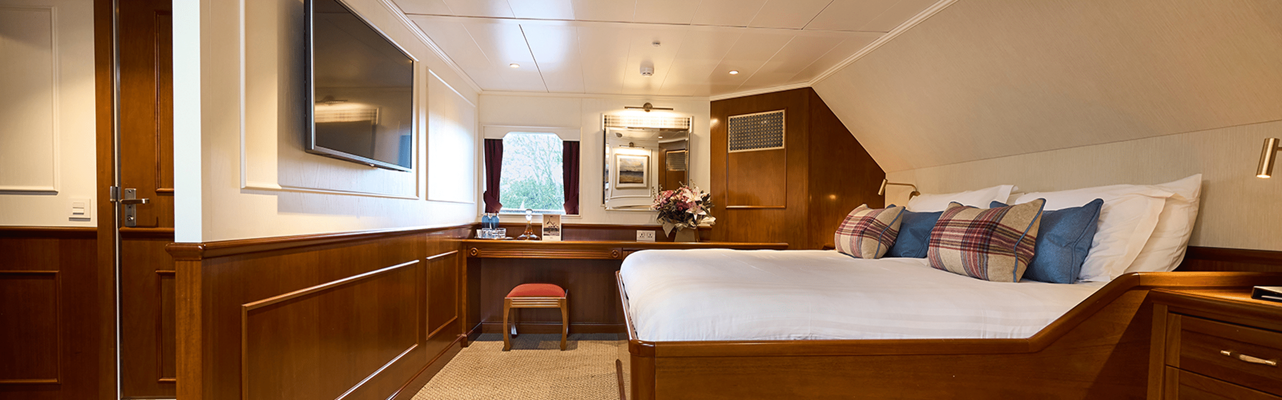 Luxury abounds on The John Buchan Deck, where the ship’s generous suite is found, along with six more cabins. Spacious, welcoming, and private, occupants can take in the dramatic, rugged scenery of the Caledonian Canal thanks to each room’s picture windows.